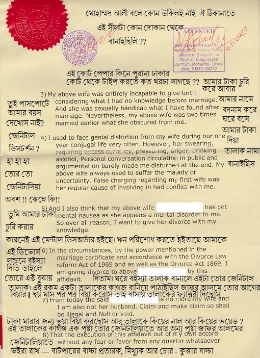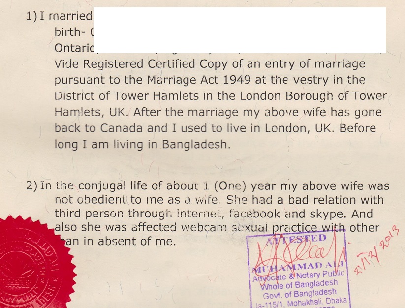 Facebook is a social media and also a trap for many marriage frauds like the Bangladeshi student in UK, Anwar Pervez. Back in May, 2012 while I was chatting with friends about my next tour to London, UK and Rome, Italy, Anwar said he lives in London and he would like to meet me in person. He came to the Gatwick Airport on May 18th 2012. I met Anwar. This marriage fraud Anwar Pervez was acting like a little innocent promising intelligent boy who could be a future leader of Bangladesh, who was working hard to complete his degree in laws but his main drawback was always on money. He needed money to study, to stay in UK, to pay for his rent, food which he cannot manage alone. He needed love, as well as financial help. Working 20 hours a week was not enough to continue his study and show a reasonable amount of money in his bank statement to get his UK student visa extended which was about to expire on January 15, 2013. I came back to Canada after finishing my tour to UK and Italy. We kept talking over phone, Facebook, Skype, etc. Anwar said he loved me very much, cannot live without me and wanted to marry me (in another word, he wanted me to pay for all and become bankrupt). Meanwhile, Anwar had to move from one rental shared accommodation to another. As usual, he begged for money saying that he does not have enough cash to pay for his first month last month. He was acting like a true lover that time. A Bangladeshi student in UK, who was working hard in a downtown fast food restaurant (McDonald�s) but could not manage to save some money for rent around that time, so he wanted to borrow some cash from me. I sent him GBP 589 on June 25, 2012 from my TD Canada Trust bank account to his London Halifax bank account. . I took a leave of absence without pay from work (stupid me lost salary during the time I was trapped). I borrowed money and went to London, UK on July 11-26, 2012 we got married same day at my sister�s Edmonton Green residence. Next day we got married again under the Muslim Sharia Law in East London Mosque on July 12, 2012. Next thing we did was served a notice for our counsel marriage (at first we set a date on December 18, 2012. At work even without pay I did not get permission for another leave of absence, so I left that job and took another job where I requested for one week leave of absence without pay. My new job site stays closed during Christmas holidays. I did not accrue any leave as I was new and a contractor employee, therefore I took two weeks off without salary. Marriage fraud Anwar Pervez in London, UK was able to change the wedding date to December 20th) at Tower Hamlet Register Office. On July 13, 2012 we had opened a joint bank account with London Halifax Bank and deposited GBP 10,000.00 into that account. Marriage fraud Anwar Pervez stolen that money slowly but surely before he left UK (Prior the money was stolen from our account by Anwar Pervez, I have sent a letter to London Halifax bank requesting them to close the account when Anwar Pervez was acting suspiciously and not cooperating with me as a husband but London Halifax bank ignored my request and let the culprit withdrawn all cash and leave UK). When I was leaving London on July 25, 2012, at Gatwick Airport, he asked for money again so I took a cash advance in the amount of GBP200 from my credit card and gave him to pay his August, 2012 rent. . On August 4, 2012 I sent him GBP150 again because he did not have enough money to buy food to feed him. On December 20, 2012 we were married according to British Law. As his UK student visa expired, Anwar left UK on January 15, 2013. He was arrived in Bangladesh on January 17, 2013. On December 20, 2012 we were married according to British Law. As his UK student visa expired, Anwar left UK on January 15, 2013. He arrived in Bangladesh on January 17, 2013. I kept talking with him on Skype, phone, email so that he returns my money that I have borrowed from the TD Canada Trust but he did not return any of the money. Instead, he sent me a divorce affidavit letter with a list of false, meaningless, irrelevant, self-contradictory total bias. It is a homemade divorce affidavit meaning he did not go to any court to file a divorce. He purchased a court stamp paper, made some seal/stamp and typed those crap over it.Once fraud is always a fraud.